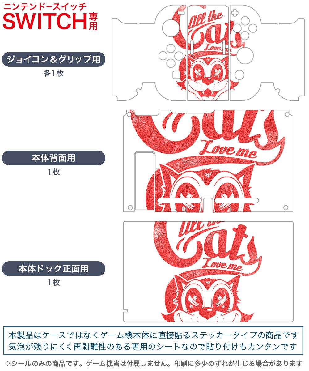 製品名 Nintendo Switch 本体裏面&ドック正面&ジョイコン専用 デザインスキンシール セット内容 Nintendo Switch 本体&ドック&ジョイコン用スキンシール(各1枚) ニンテンドースイッチ専用です。