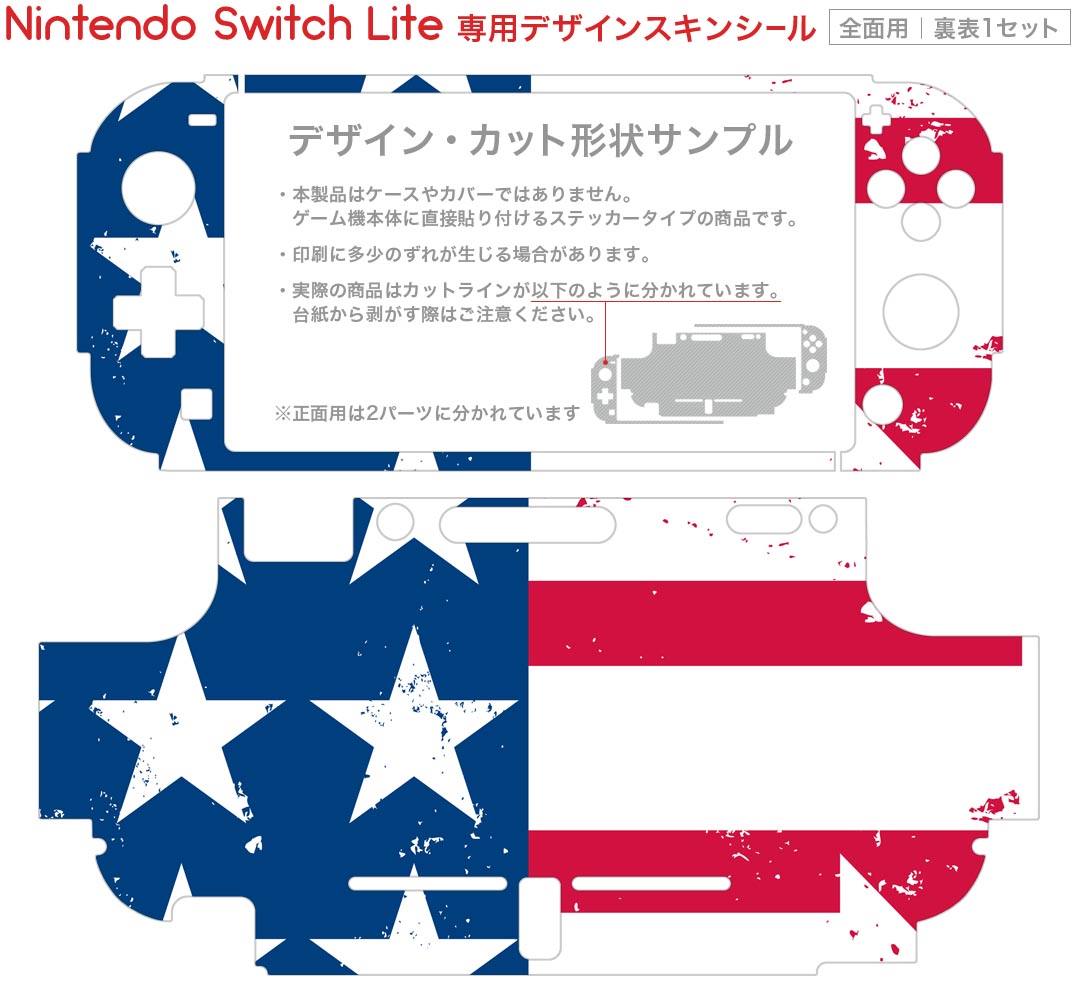 製品名 Nintendo Switch Lite専用 デザインスキンシール セット内容 Nintendo Switch Lite本体用スキンシール(裏表)各1枚 ※液晶側シールは2パーツに分かれていますニンテンドースイッチライト専用です。