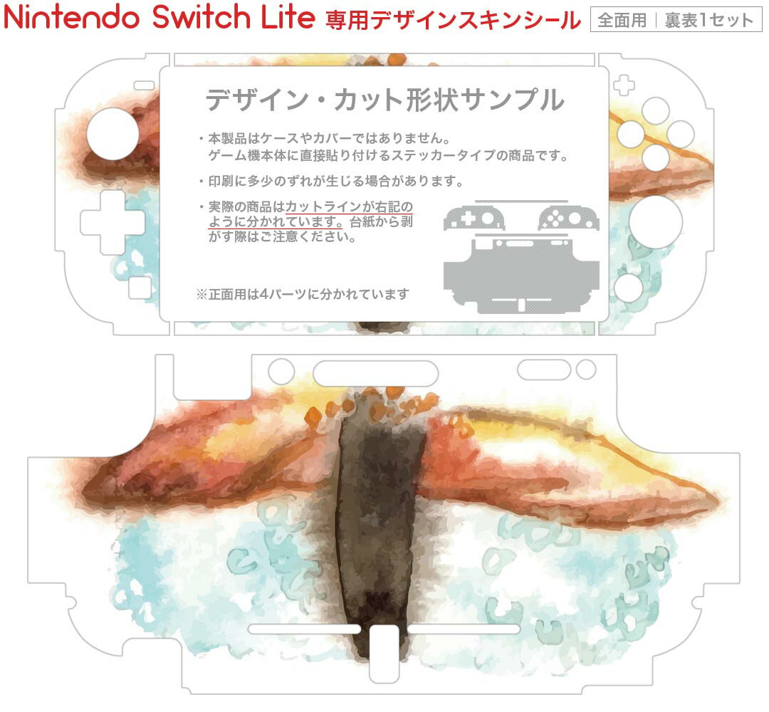製品名 Nintendo Switch Lite専用 デザインスキンシール セット内容 Nintendo Switch Lite本体用スキンシール(裏表)各1枚 ※液晶側シールは2パーツに分かれていますニンテンドースイッチライト専用です。