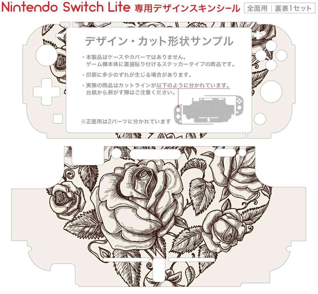 製品名 Nintendo Switch Lite専用 デザインスキンシール セット内容 Nintendo Switch Lite本体用スキンシール(裏表)各1枚 ※液晶側シールは2パーツに分かれていますニンテンドースイッチライト専用です。